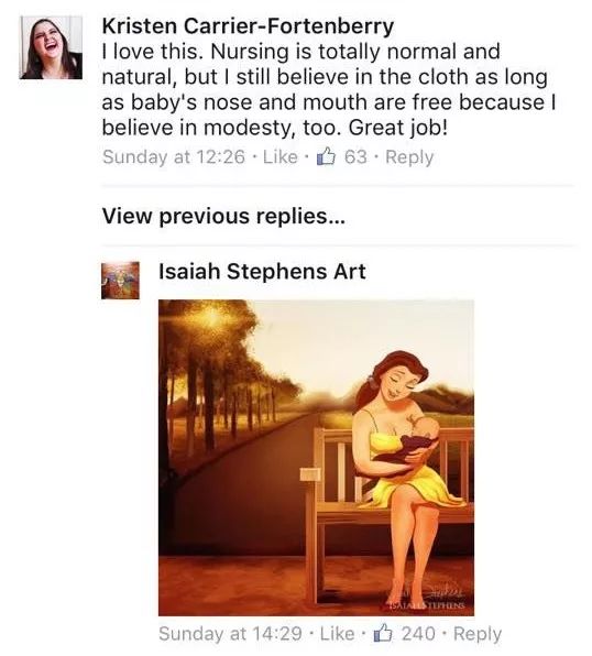 我們看到了插畫作者的解釋,他說,其實貝爾喂奶他創作了兩個版本,有蓋巾和沒蓋巾的都有。為了不引起爭議,他在臉書放的是有蓋巾的。不過,他依然單獨放出了沒蓋巾的那一版。