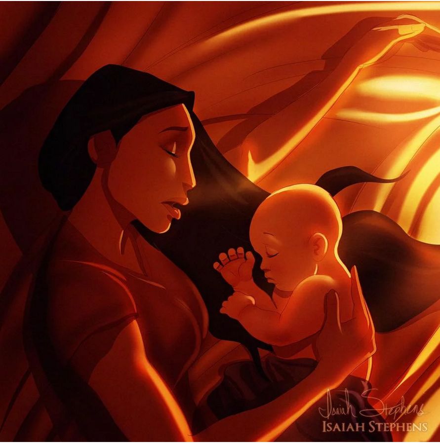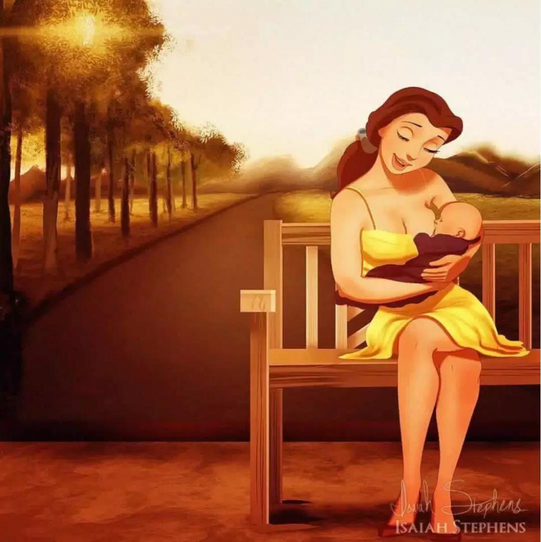 Stephens是以母親節為主題創作了這組插畫,一共9張。每副插畫上,都是一位知名的迪士尼公主在做母親常做的事,比如喂奶、換尿布、甚至還有分娩。