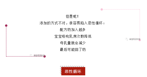 理性添加配方奶,不要一次性用配方奶喂飽寶寶,還是要先讓寶寶多吸吮乳房。惡性循環出現追根到底還是配方奶加的太多太頻繁。為什么會想添加配方奶?因為奶量不足夠滿足寶寶,那我們除了理性添加配方奶之外,還多一項任務“追奶!!!”