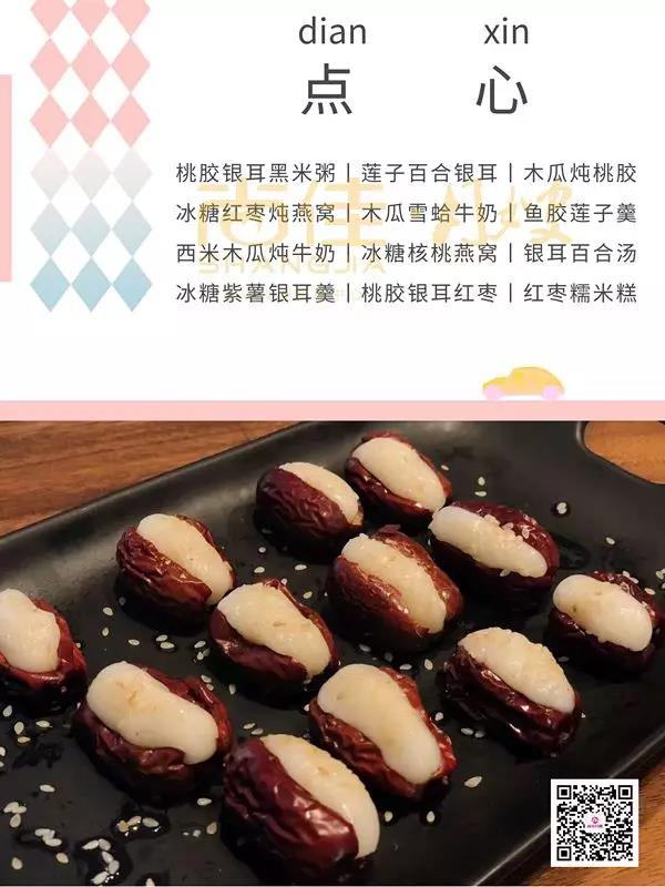 月子餐里的點心是為產(chǎn)婦滋補、美容養(yǎng)顏、滋陰潤燥。點心的甜度根據(jù)產(chǎn)婦的口味而調(diào)配,月子也不宜吃太甜會容易導致血糖高與影響身體恢復噢!