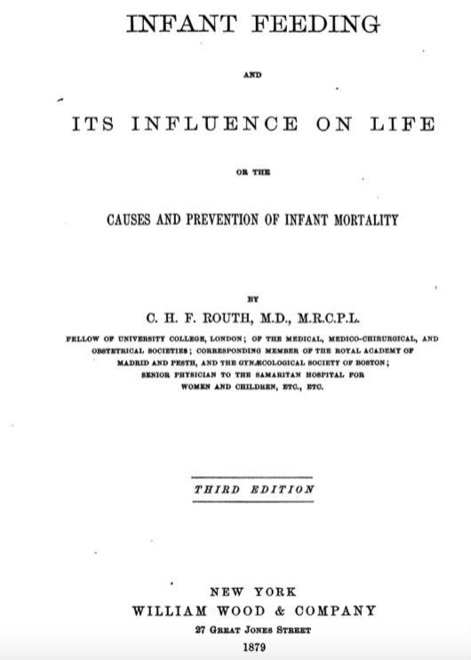 4、Routh C H F. Infant feeding and its influence on life, or, The causes and prevention of infant mortality[M]. William Wood & Company, 1879.