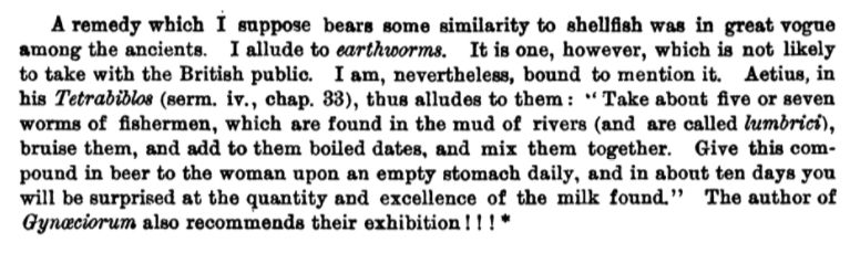 在1879年出版的書籍 Infant feeding and its influence on life, or, The causes and prevention of infant mortality 中也記錄了母乳不足時,可以喝啤酒、葡萄酒等來增加奶量,甚至書中還記錄了一個頗為重口味催乳偏方——把蚯蚓和煮熟的棗攪拌,再與啤酒混合,每天空腹喝下,連續十天可讓奶量增加。