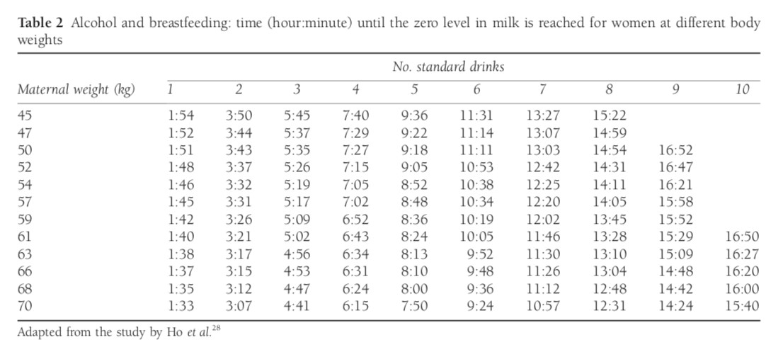 等待的時間可以借助下面這張表格來估計,表格左側這欄是體重,表格上方第一欄表示攝入的酒精量,一個標準杯所含酒精量為10g。表中的時間為從開始飲酒到乳汁中酒精含量減少為零所需的時間。