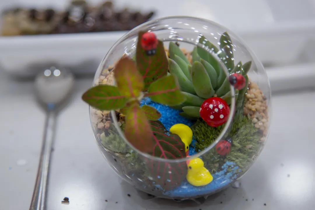 微景觀DIY就是將苔蘚、多肉等植物加上籬笆、砂石、卡通人物、動物等,裝進一個