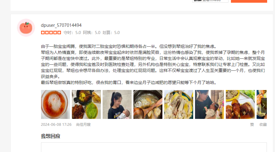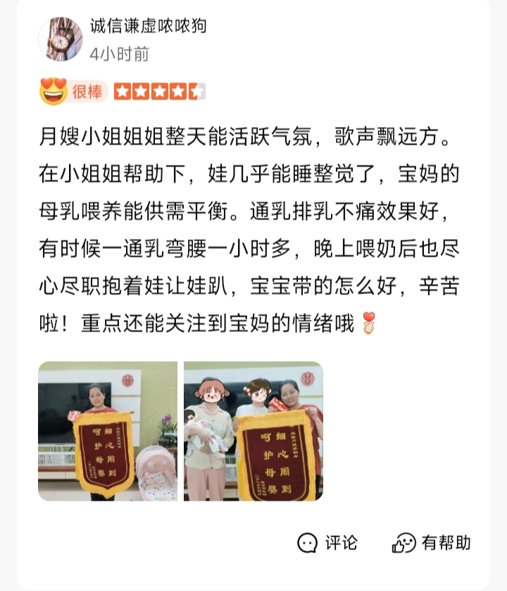 蘇姐姐,來自廣東豐順,性格溫和,好相處,接觸育嬰這個行業已有幾年經理,照顧產婦和至今,掌握新生兒日常喂養,生活清潔護理,以及新生兒黃疸、紅臀、腹瀉、臍部、消化不良的辨別及護理,掌握新生兒撫觸操,被動操,兒歌,溫柔的、有趣的視情況逐一對寶寶進行五項行為訓練;對寶媽生活起居細心照料,幫助寶媽產后開奶、傷口消毒、乳房護理,給予寶媽科學的母乳喂養指導,并擅長做營養的月子餐食等等。相信在她的護理之下,一定能讓你坐一個舒適又愉快的月子!