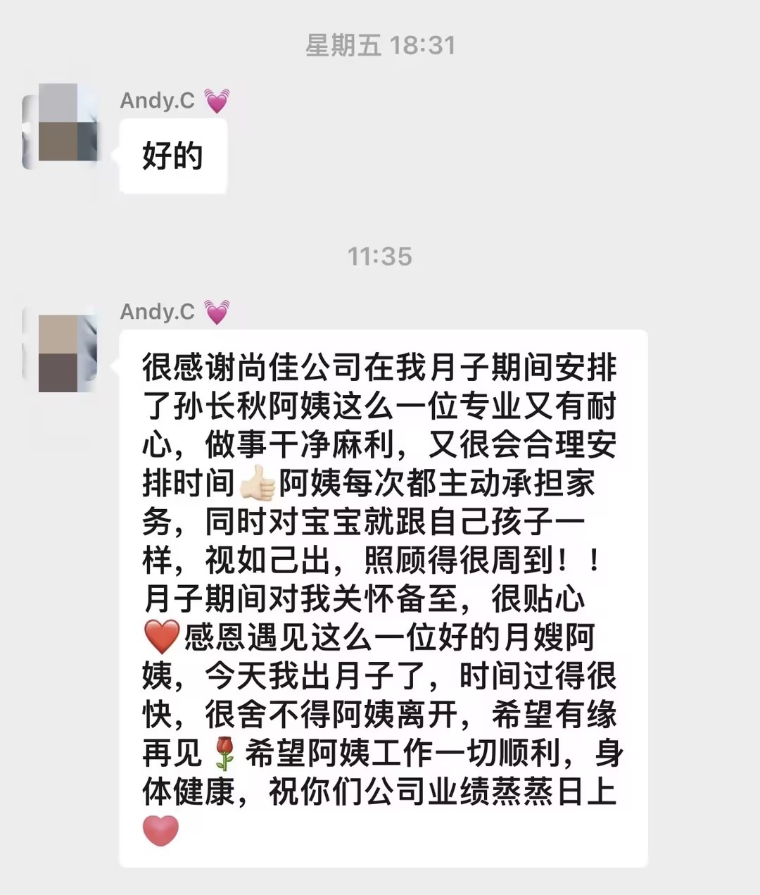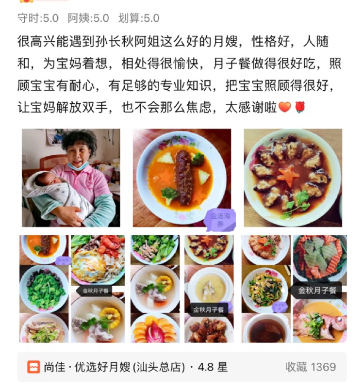孫阿姨來自黑龍江雞西市,會粵語,性格開朗,熱情大方,細心有耐心,做事有規劃會提前做充分準備。從事母嬰行業多年,服務了多個母嬰家庭,帶過多個雙胞胎家庭,擅長新生兒日常喂養活及清潔護理,新生兒黃膽、紅臀、腹瀉、消化不良的辯別及護理,撫觸、被動操寶寶作息規律的培養。對于產婦起居照料、傷口護理與消毒、產后開奶和乳房護理、惡露排出護理、科學的母乳喂養指導。調理寶媽既有母乳給寶吃又不胖的月子步,各種營養善食搭配!做菜美味可口,擅長潮汕菜,煲湯還會做面食。工作認真負責,細致周到!孫阿姨每次服務都能得到寶媽及家