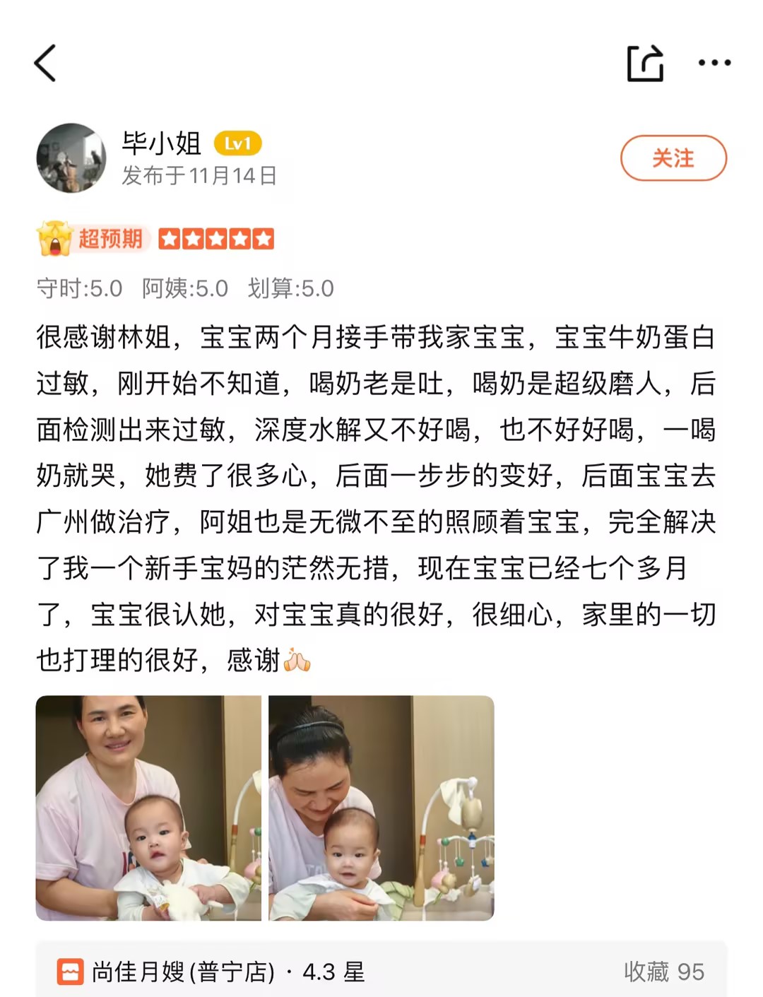 楊姐36歲湖北人,待人熱情,干凈勤勞,綜合素質佳,能吃苦耐勞,忠誠穩重,工作積極主動,樂于與人溝通,尊老愛幼,愛崗敬業,有多年的護理經驗,有沖勁。對待寶寶寶媽就像對待自己的家人一樣,悉心照料。