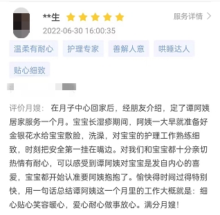 譚阿姨來自廣東新豐,性格溫和穩重,做事認真,照顧寶寶細致耐心,眼里有活、做事麻利、勤快愛干凈。從事母嬰行業多年,有著豐富的護理經驗。帶過早產兒、低體重兒等特殊寶寶,服務多位雙胞胎寶寶。服務過妊娠糖尿病、高血壓寶媽。專業舒適的催乳手法令服務過的寶媽都贊不絕口,寶寶護理專業、細致耐心、觀察力強、調整調整寶寶作息規律。譚阿姨是廣東人,會做地道的粵菜及潮汕菜,煲的一手靚湯。譚姐是真的很熱愛這個行業,入職公司以來,在單率一直在90%,客戶滿意度達100%,她用自己的真心與熱愛來呵護每一個家庭。
