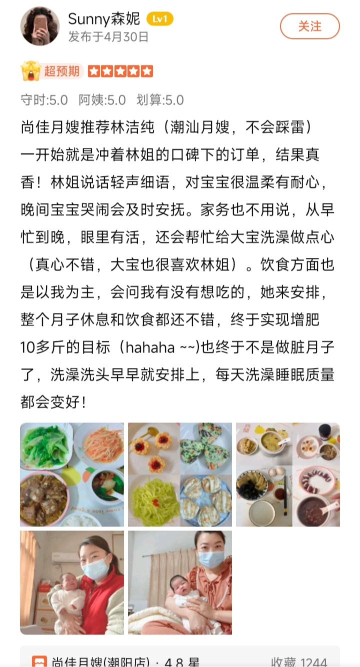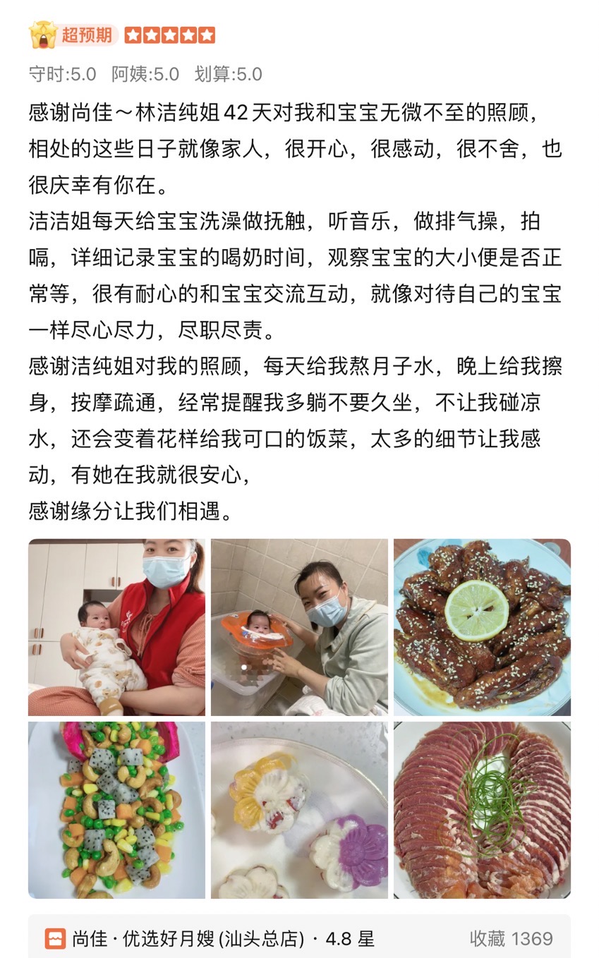 林姐潮汕本地人,性格溫和、愛干凈、做事認真細心,脾氣好,服從性強。進入尚佳學習母嬰護理知識,對于新生兒護理會:黃疸的觀察、濕疹、熱疹的觀察與護理、紅臀的護理、撫觸操等。在產婦的護理上會:乳房的基本護理、擦浴、情感疏通、及身體適當的按摩、惡露察等日常護理。比較擅長做潮汕家常菜系+煲湯等,工作中盡心竭力的服務好每一位寶媽和寶寶;