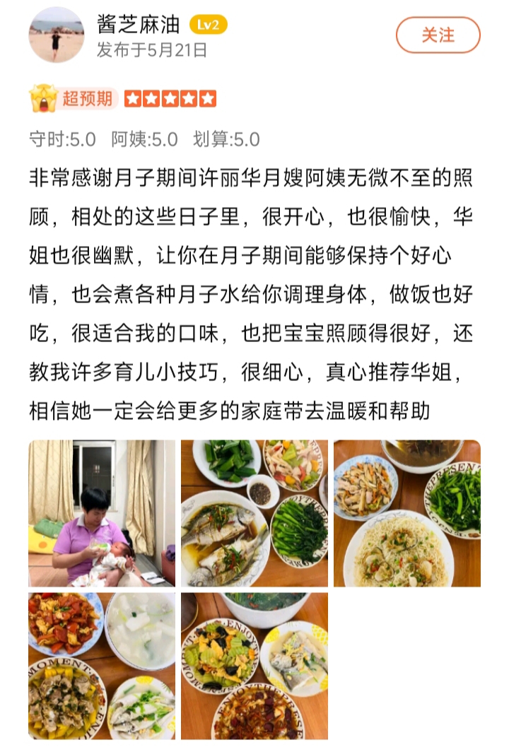 許姐來自福建詔安,會說潮汕話,溝通能力強,為人老實熱心,因喜歡寶寶加入了母嬰護理行業,對寶寶的護理非常細致,更換紙尿褲、洗澡,三操等都很細心,對產婦也是日常關心,做的月子餐也很不錯。