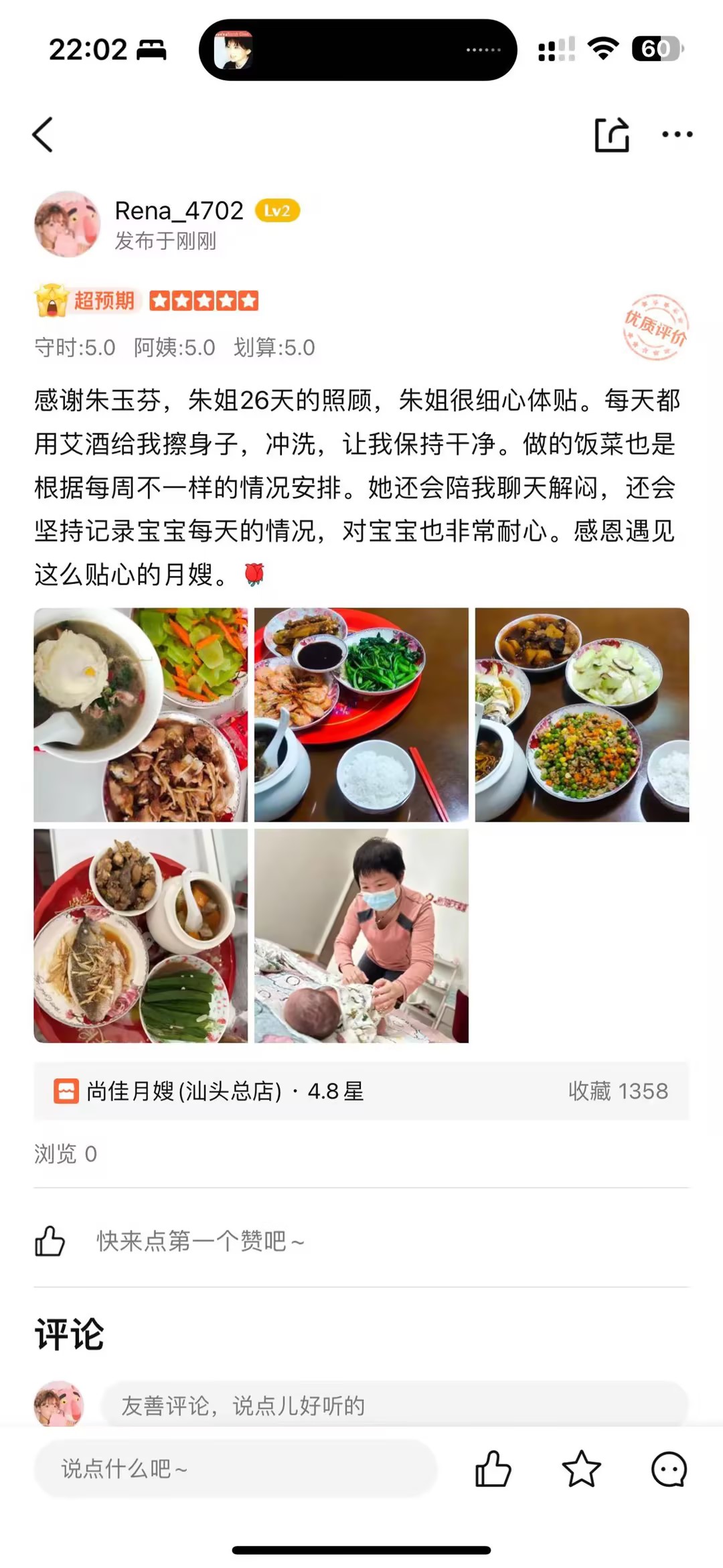 芬姐動手能力強,月子護理經驗十分豐富。在護理新生兒方面很細心,注意細節,無論是寶寶的洗澡、撫觸、還是早早教,都能用心呵護,對寶寶的各種情況都能處理得很好,無論是溢奶還是其他不舒服,總能正確判斷,并迅速采取正確的措施,并且月子餐做的也很好哦。